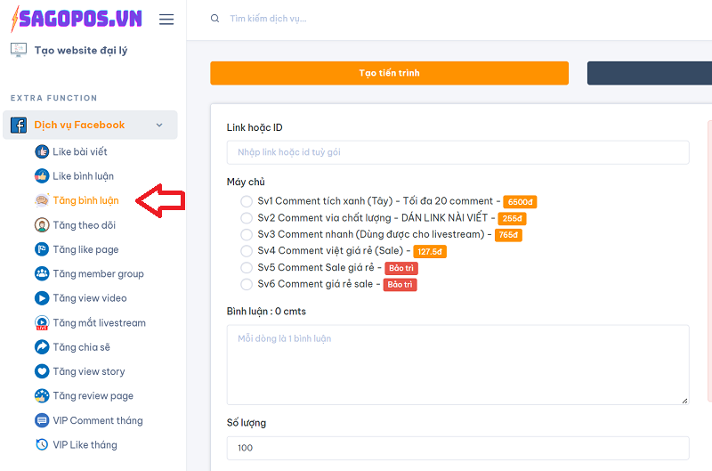 Bước 1: Đăng nhập vào hệ thống Sagopos.vn và chọn dịch vụ tăng bình luận trên Facebook