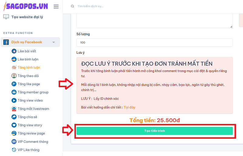 Bước 6: Ấn vào "Tạo Tiến Trình" và tiến hành tăng comments cho bài viết trên Facebook