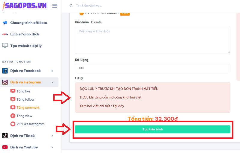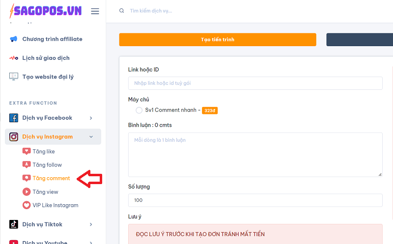 Bước 1 : Đăng nhập vào hệ thống Sagopos.vn và chọn dịc vụ tăng comment Instagram