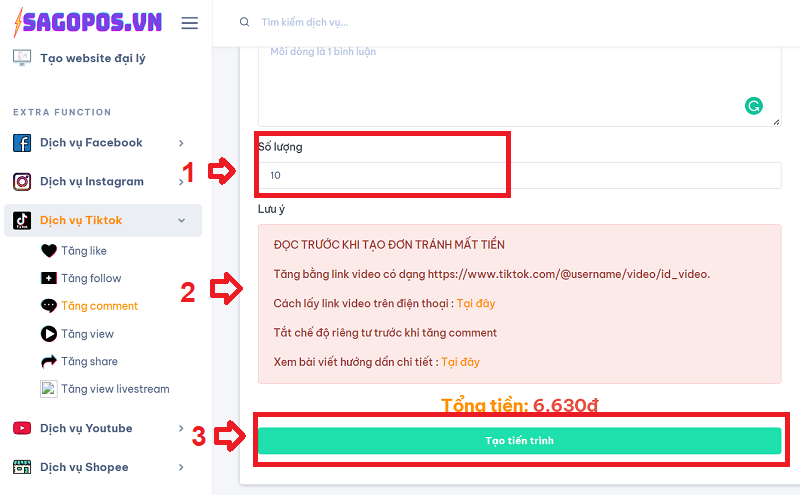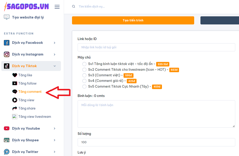 Bước 1 : Đăng nhập vào hệ thống Sagopos.vn và chọn đúng dịch vụ tăng comment trên Tiktok
