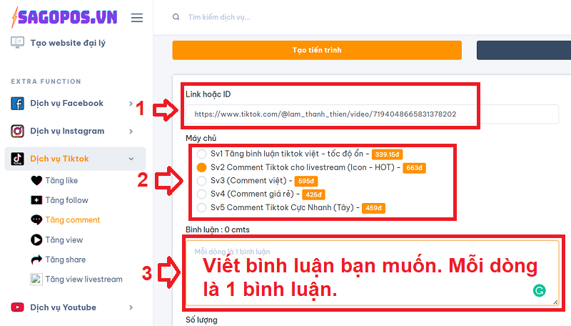 Bước 4 : Nhập link vừa sao chép vào hệ thống Sagopos.vn, sau đó chọn server và viết comment bạn muốn