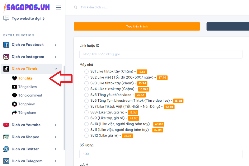 Bước 1 : Đăng nhập vào trang web Sagopos.vn và chọn dịch vụ tăng tim Tikok