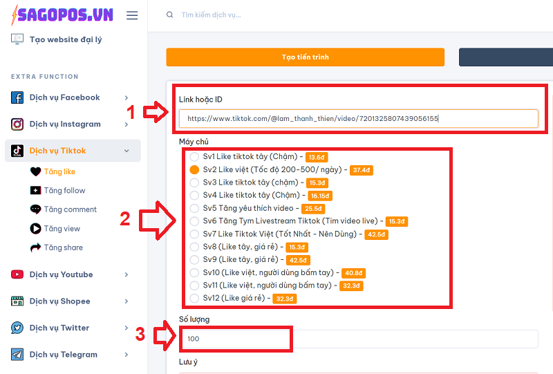 Bước 4 : Nhập link video Tiktok vừa sao chép được vào hệ thống Sagopos.vn sau đó chọn Server và số lượng cần tăng tim cho video