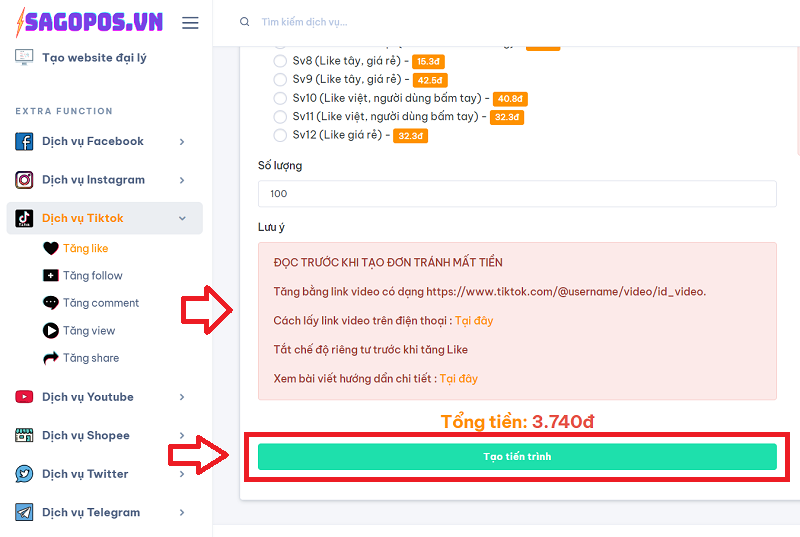 3. Hướng dẫn các bước thực hiện tăng like(tim) video Tiktok trên hệ thống Sagopos.vn
