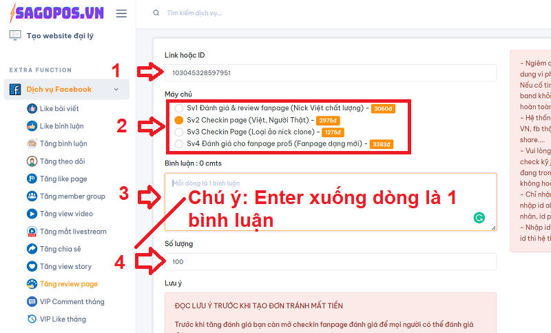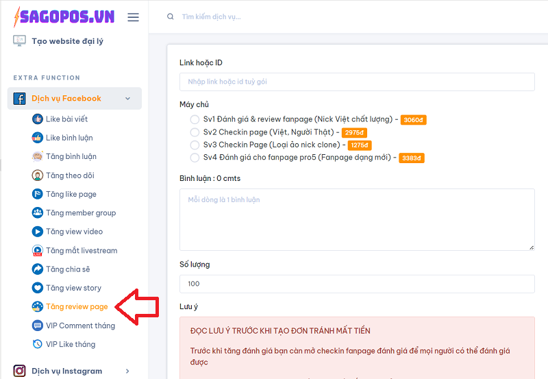 Bước 1 : Đăng nhập vào hệ thống Sagopos.vn và chọn đúng dịch vụ tăng review fanpage