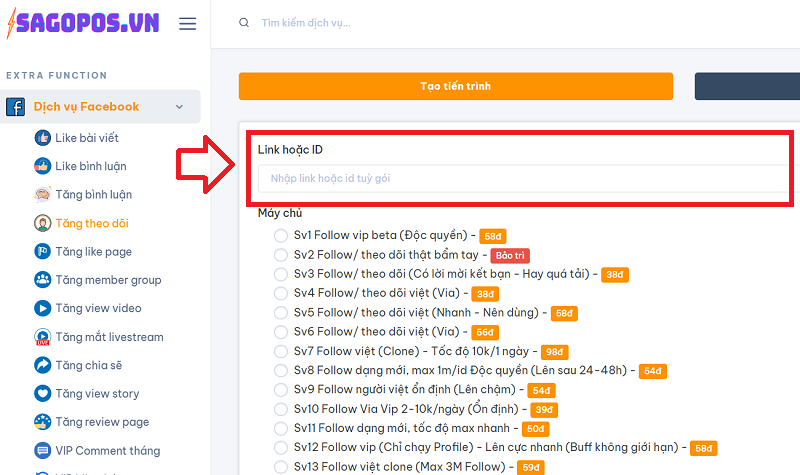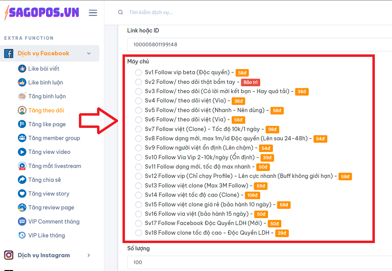 Kế tiếp là tiến hành chọn sever cần tăng theo dõi trên Facebook(có nhiều sever để giúp bạn tăng được nhiều facebook cùng một lúc , hoặc chạy theo dõi số lượng lớn, giá cả sever càng cao đồng nghĩa với chất lượng cao hơn và tỷ lệ tụt theo dõi cực ít).