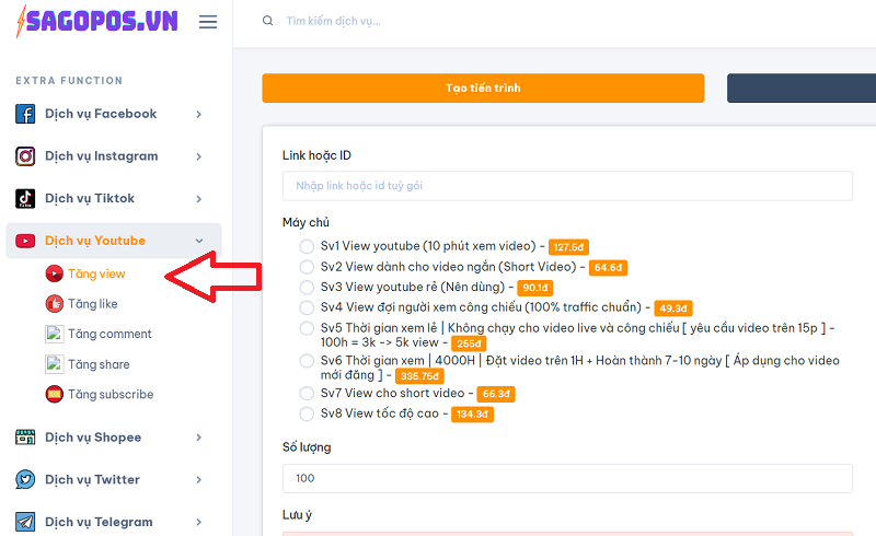 Bước 1 : Đăng nhập vào hệ thống Sagopos.vn và chọn dịch vụ tăng view Youtube