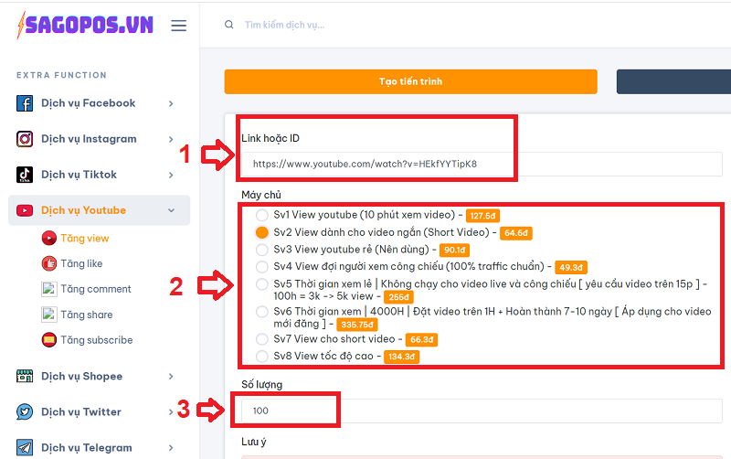 Bước 4 : Dán link video vừa sao chép được vào hệ thống Sagopos.vn sau đó chọn server và số lượng tăng view