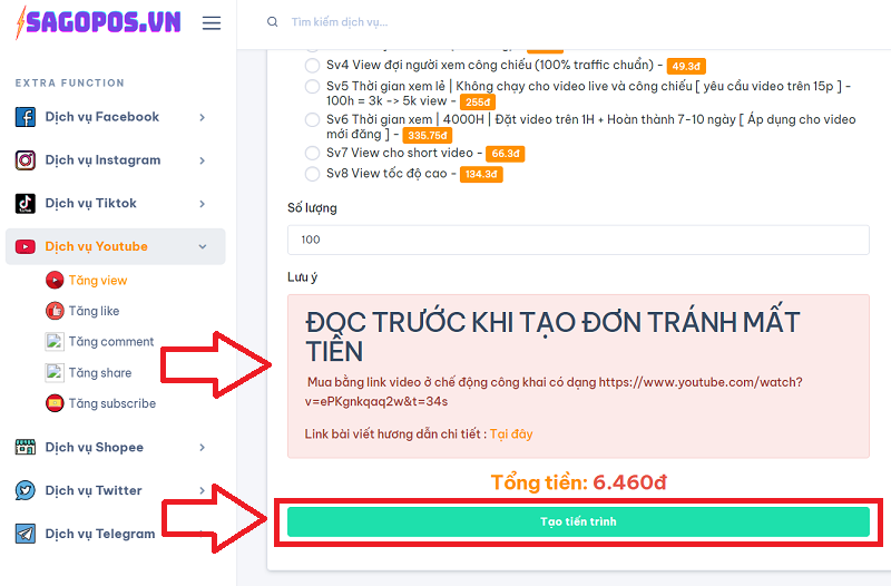 Bước 5: Xem kỹ "lưu ý" và ấn vào "Tạo Tiến Trình" để tiến hành tăng lượt xem cho video trên Youtube